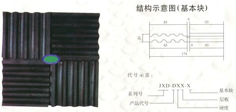 JXD型减振垫基本块体尺寸(长×宽,单位:mm)120×120、174×174,根据荐载大小,可将基本块体用钢锯分割成60×120和85×174的1/2和1/4块使用,其竖向许可荐分别为基本块的许可荐载的1/2和1/4。也可将减振垫迭合成两层、三层、四层串联使用,许可荷载仍为基本块体的许可荷载。每一尽寸又分为400、600、800 三种规格,可适应不同垂向设计荷载。